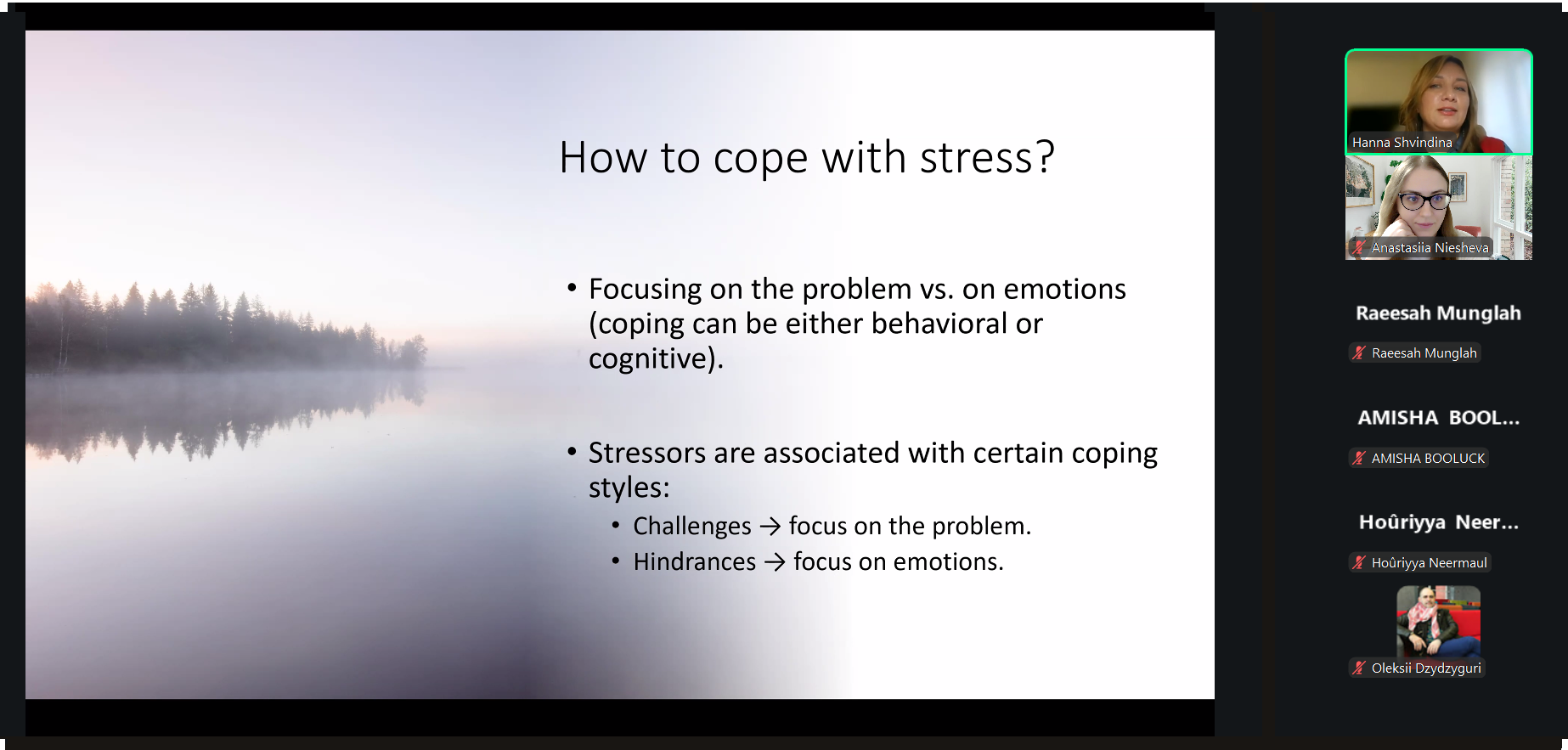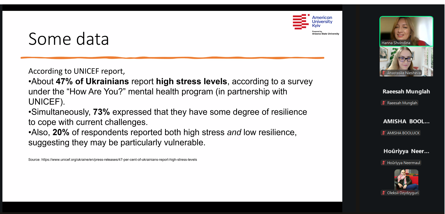 Пані Швіндіна – випускниця програми Фулбрайт, США, та CEO ГО “Центр освіти впродовж життя” – виступила з лекцією на тему «Modern Trends in Leadership Studies: Resilience, Stress Management, Gender Sensitive Aspects of Leadership». У своїй презентації вона розглянула актуальні методології лідерства, техніки управління стресом та гендерно-інклюзивні практики лідерства, а також представила результати власних досліджень.
