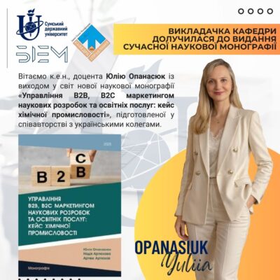 The O. Balatsky Department of Management congratulates PhD in Economics, Associate Professor Yuliia Opanasiuk on the release of a new scientific monograph prepared in co-authorship with Ukrainian researchers.