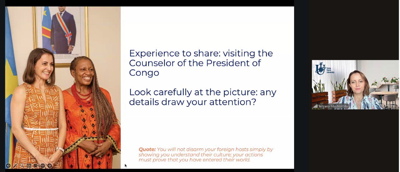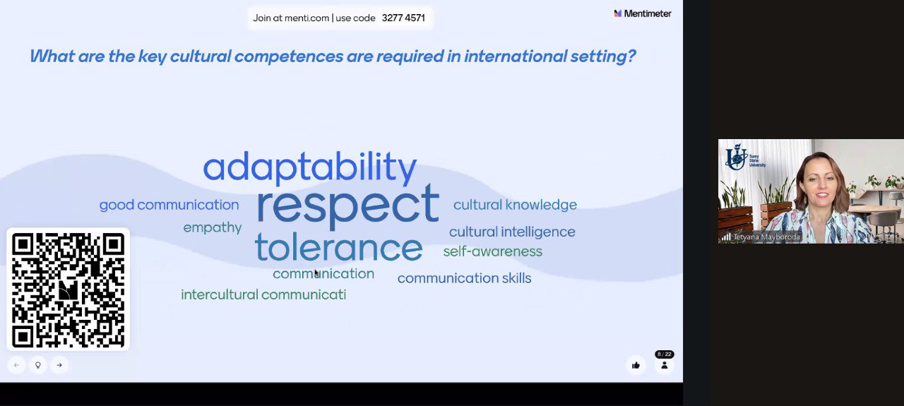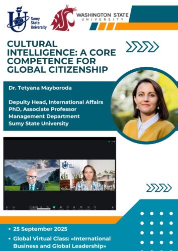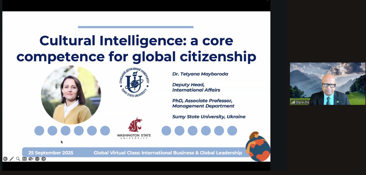 On Thursday, September 25th, Tetyana Mayboroda, Associate Professor at Sumy State University and COIL Ambassador of SUNY for 2025-2026, delivered a guest lecture on the topic “Cultural Intelligence: a core competence for global citizenship” as part of a Global Virtual Class “International Business and Global Leadership” led by Professor Dipra Jha, Scholarly Associate Professor & Fulbright specialist, Carson College of Business, Washington State University, USA.