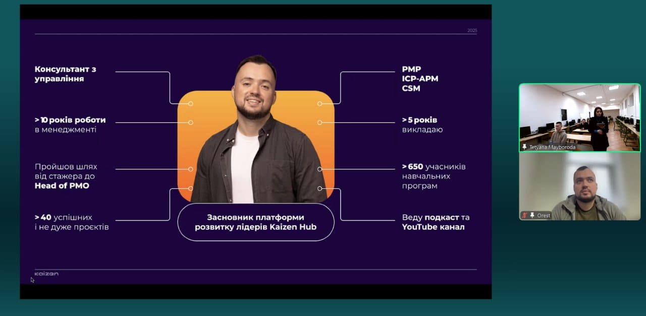 The event was moderated by Associate Professor of the Department – Tetyana Mayboroda, lecturer of the courses “Project Team Management” (Master’s programme “Project Management”) and “Conflict and Change Management in Organisations” (Bachelor’s programme “Management”).“I sincerely thank all students and colleagues who joined the lecture for their active participation in the Q&A session – it clearly demonstrated both the relevance and practical value of the topic. My deepest gratitude goes to Orest, who, despite his military service, finds time to share his experience with our students and inspire us by his example.”