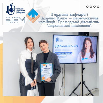 Вітаємо студентку кафедри управління імені Олега Балацького Дарину КІЧКО із заслуженим визнанням– «Кращий студент у номінації: Громадська діяльність. Студентські ініціативи».!
