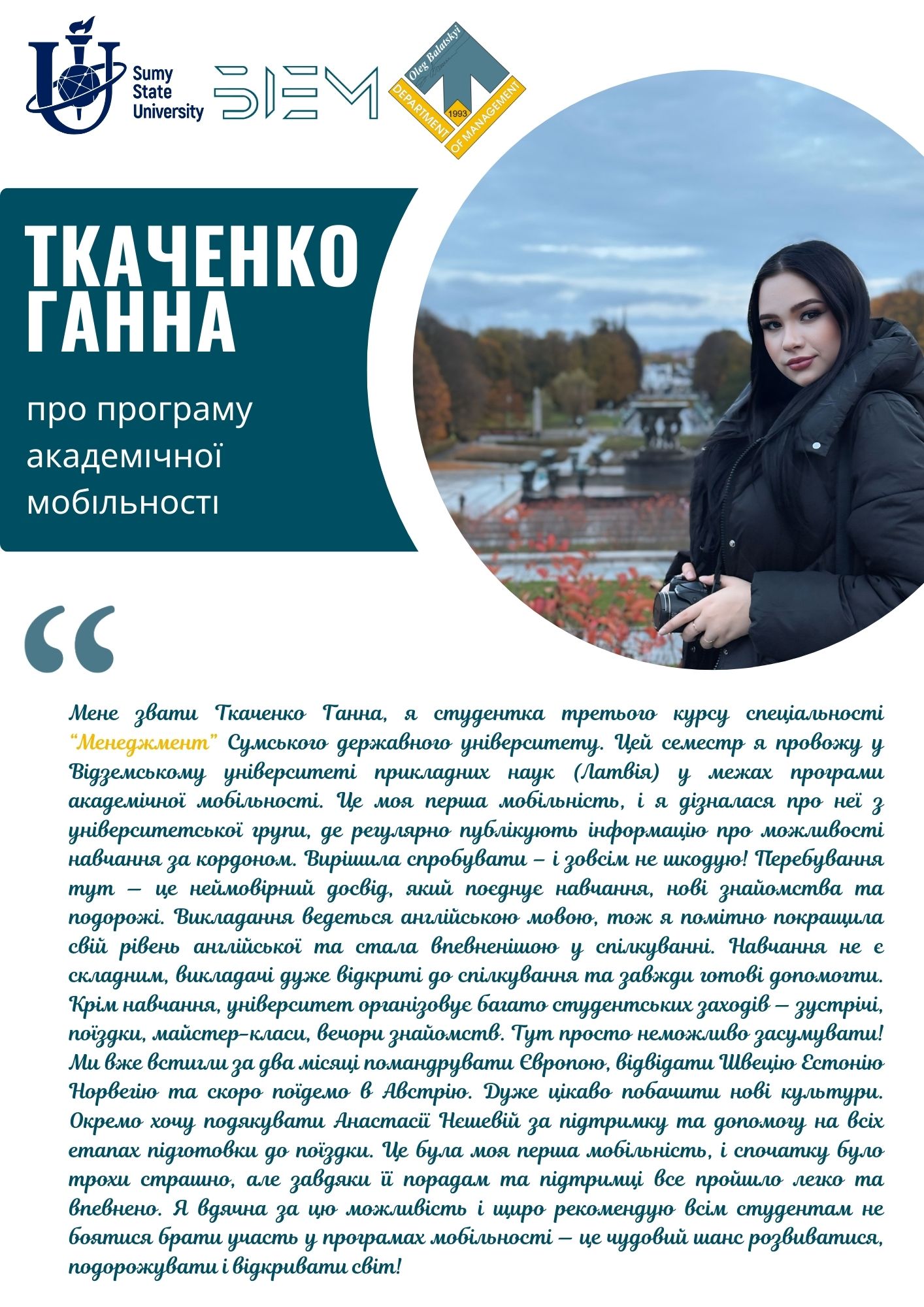 У межах реалізації програм академічної мобільності студентка третього курсу спеціальності «Менеджмент» Сумського державного університету Ганна Ткаченко у поточному семестрі навчається у Відземському університеті прикладних наук (Латвія). Участь у програмі дала змогу здобути досвід навчання в міжнародному академічному середовищі, поглибити знання англійської мови, розширити міжкультурні компетентності та долучитися до активного студентського життя європейського університету.