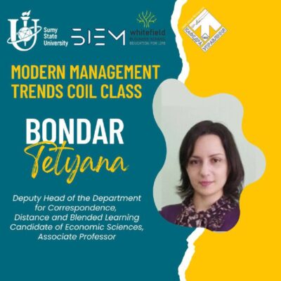 У межах віртуального курсу COIL “Modern Management Trends”, організованого кафедрою управління ім. О. Балацького Сумського державного університету та Уайтфілдською бізнес школою, відбулася третя сесія за участі Тетяни Бондар, старшого викладача Сумського державного університету.