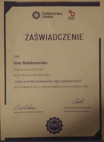 10 жовтня 2025 року Інна Балагуровська взяла участь у курсі «Dobre praktyki prowadzenia zajęć dydaktycznych», організованому Centrum Nowoczesnego Kształcenia (Politechnika Śląska). Захід був спрямований на ознайомлення учасників із сучасними методами та підходами до викладання, підвищення якості освітнього процесу та вдосконалення педагогічної майстерності. Учасники курсу мали можливість дізнатися про інноваційні форми проведення занять, принципи активного навчання, ефективні стратегії взаємодії зі студентами, а також способи формування мотивації до навчання. Особливу увагу було приділено питанням академічної доброчесності, оцінювання результатів навчання та розвитку комунікаційних навичок викладача. Отримані знання та практичні рекомендації стануть корисними у подальшій викладацькій діяльності, сприятимуть підвищенню якості навчальних курсів і впровадженню сучасних освітніх практик.