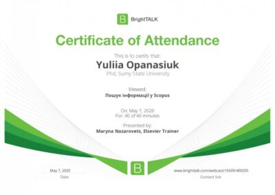Старший викладач кафедри управління Опанасюк Ю.А. прийняла участь у вебінарі «Інформація про пошук у Scopus» від тренера Elsevier Марини Назаровець. Протягом вебінару учасники дізналися як отримувати відповідні послуги у Scopus, як користуватися простим та розширеним пошуком за документами, як працювати з отриманими результатами, їх аналізувати, експортувати, виробляти та створювати повідомлення.