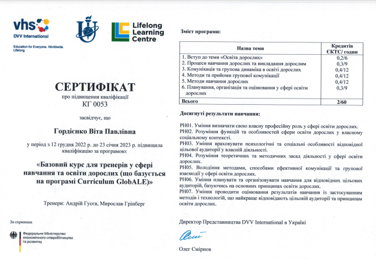 З 12 грудня 2022 року по 25 січня 2023 року на базі Центру розвитку кадрового потенціалу Сумського державного університету була реалізована програма підвищення кваліфікації «Базовий курс для тренерів у сфері навчання та освіти дорослих (що базується на програмі Curriculum GlobALE)». У програмі взяли участь викладачі кафедри Альона Євдокимова і Віта Гордієнко.