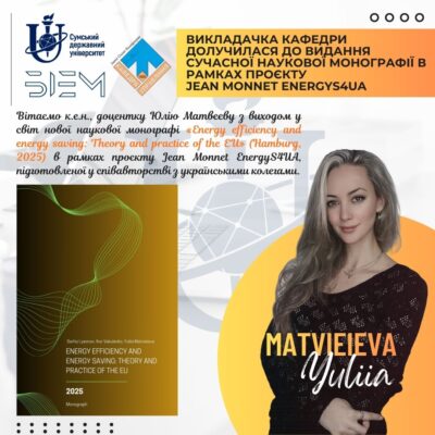 Монографія: «Energy efficiency and energy saving: Theory and practice of the EU» (Hamburg, 2025) присвячена сучасним європейським підходам до забезпечення енергоефективності та енергозбереження в умовах переходу ЄС до кліматичної нейтральності.